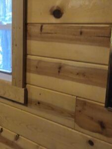 Two more coats of stain yet. We now are looking for a Lowes or Home Depot or even Spenard builders to donate 700 sq ft. of 6″ tounge and groove pine for interior walls. Any leads, please let us know. Happy Trails!!